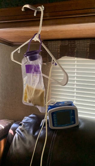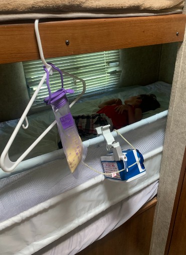 Obviously he needs his formula for nutrition. The importance of packing the actual formula can sometimes overshadow the necessary equipment to administer it. You don’t want to forget the feeding bags, pump, or the charging cord. We typically have the feeding pump attached to an IV pole, if you can’t bring a pole you have to get a little creative. Here are some pictures using a hanger to make life easier.