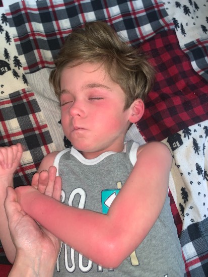 Our last camping trip was a bit rough. Holden has developed quite the intolerance to heat and sun. He has always been sensitive to it, but now we can’t even take him outside or he turns red. It looks like he has a sunburn but he doesn’t. If it’s any hotter outside than 76 F, he really just can’t be outside. To the right is a picture of him after being exposed to a break in the clouds for literally 30 seconds.